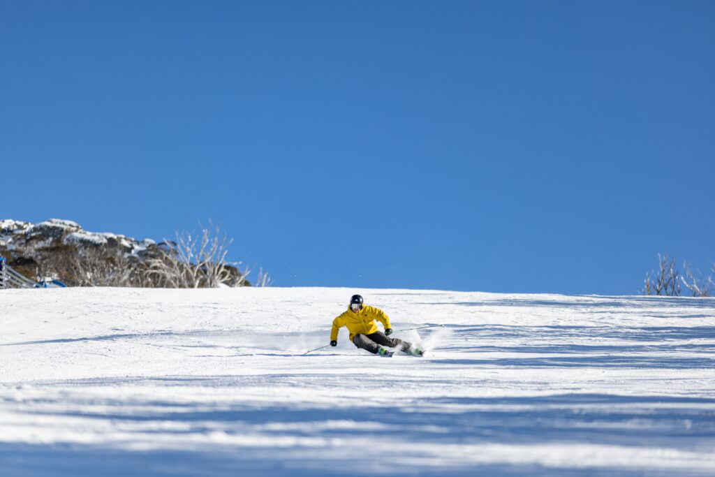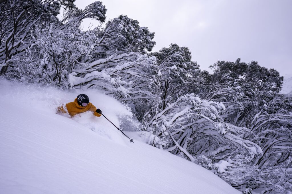 At Hotham we were fortunate to have some of the most talented skiers in the world turn their skis however they wanted. Olympian Harry Laidlaw scored the best powder day of the season in July. One of Australia’s leading GS skiers, Harry skis with grace and power and is equally at home off piste as he is on. I was fortunate to be skiing with Harry this day and it was a privilege to witness him strap the wide boards to his feet and rip some powder turns wherever he wanted.